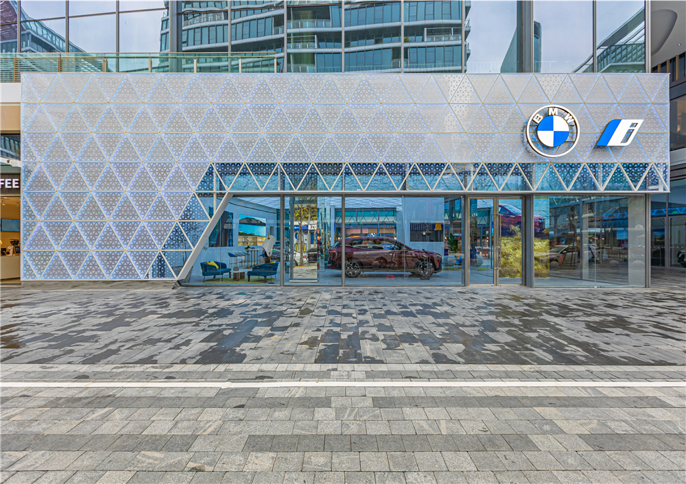 深圳歡樂港灣,是臨海的黃金商區(qū)。項(xiàng)目選址于此,希望其打造為一個(gè)有機(jī)的場(chǎng)所,賦能BMW i品牌,增益在地生活。因此,設(shè)計(jì)師要構(gòu)筑的不只是一個(gè)高品質(zhì)空間,更是以人為本的全方位優(yōu)質(zhì)交互體驗(yàn)。進(jìn)店之前,數(shù)字化體驗(yàn)旅程就已開始。迎賓立面覆蓋“BMW i車型前進(jìn)氣格柵的經(jīng)典菱型元素”為母題的半透明幕墻,以動(dòng)態(tài)流轉(zhuǎn)的當(dāng)代光電藝術(shù),與城市產(chǎn)生對(duì)話。
